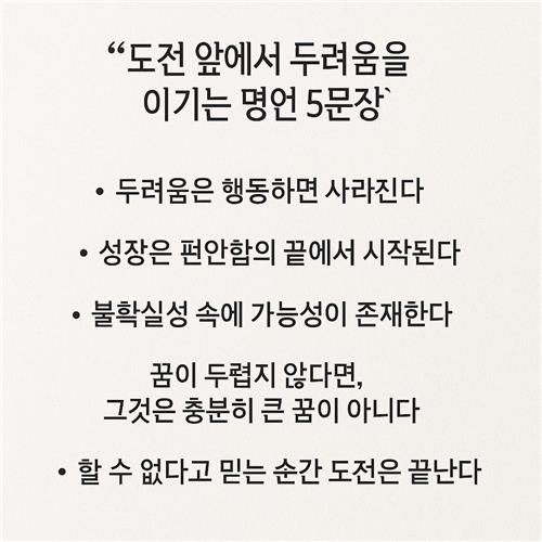 새로운 도전 앞에서 발이 쉽게 떨어지지 않을 때가 있습니다. 두려움은 무모함을 막아주는 경고이자, 한편으로는 성장의 문턱을 지키는 문지기이기도 하죠. 이 글에서는 마음을 단단히 세워주는 다섯 문장과 함께, 실전에서 어떻게 적용할지까지 차근차근 정리했습니다. 오늘 단 한 문장이라도 마음에 담아 두고, 작은 실천으로 이어가 보세요. 두려움은 사라지는 것이 아니라 다루는 법을 배우는 것에서 시작됩니다.