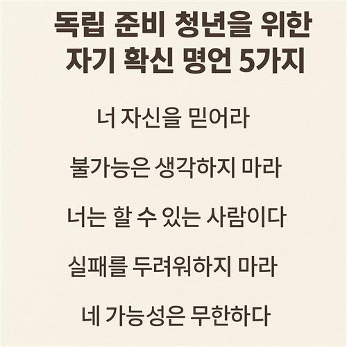 혼자서 인생을 헤쳐 나가야 하는 순간, 많은 청년들이 막막함과 두려움을 느끼곤 합니다. 특히 독립을 준비하는 시기에는 자기 자신을 믿는 확신이 무엇보다 중요하죠. 이번 글에서는 당신의 마음을 다잡아줄 자기 확신 명언 5가지를 소개하고, 그 의미를 함께 나누고자 해요. 지금 막 독립을 앞두고 있다면, 혹은 혼자 걷고 있는 길이 버겁게 느껴진다면 이 글이 작은 용기와 위로가 되길 바랍니다.