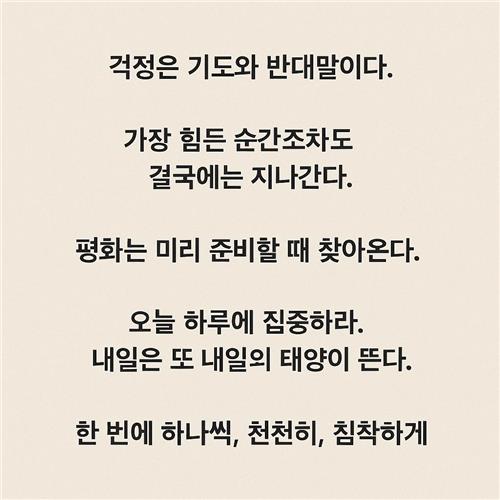불안은 잘못된 감정이 아니라 우리를 지키려는 신호입니다. 아무리 큰 파도라도 결국은 잦아듭니다. 오늘 소개한 다섯 문장 중 하나를 골라 호흡과 연결해 보세요. 몸이 기억한 평온을 다시 불러오는 연습을 거듭하면, 삶의 속도가 조금 빨라져도 쉽게 휘청이지 않게 됩니다. 여러분의 선택과 이유를 댓글로 공유해 주시면, 서로의 문장이 서로의 등불이 될 것입니다.