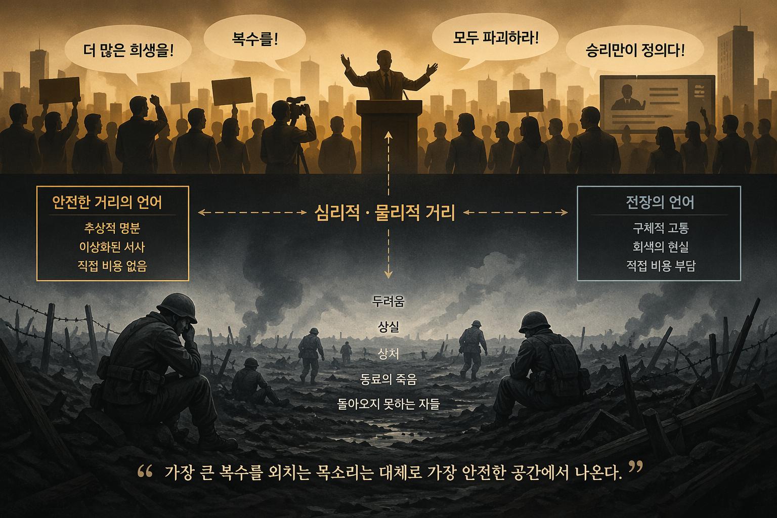 전쟁을 직접 경험한 군인들이 남긴 기록에는 공통된 관찰이 담겨 있다. 총성을 들어본 적 없는 사람들이 오히려 더 많은 희생을, 더 많은 복수를, 더 많은 파괴를 요구한다는 것이다. 이 현상은 19세기 미국 남북전쟁부터 20세기 세계대전에 이르기까지 반복적으로 기록되어 왔으며, 현대 심리학과 정치학에서도 유사한 패턴이 관찰되고 있다.