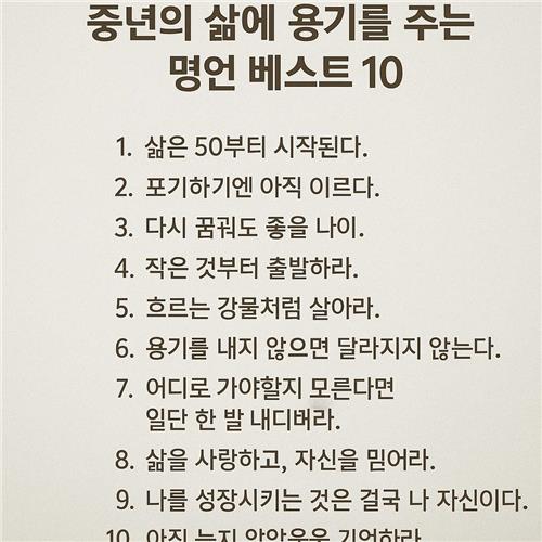 오늘은 중년의 삶에 따뜻한 위로와 용기를 건네주는 명언 10가지를 소개해 드릴게요.